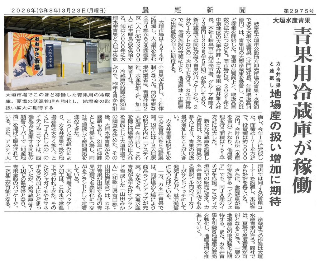 岐阜新聞に、大垣水産青果様(大垣市公設地方卸売市場)、JA全農岐阜様との取り組みが紹介されました。